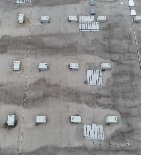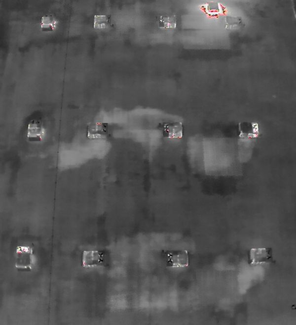 Thermal drone imaging can detect water intrusion within a roofing system. The bright white heat signatures are saturated areas that are being warmed from the heat inside the building.